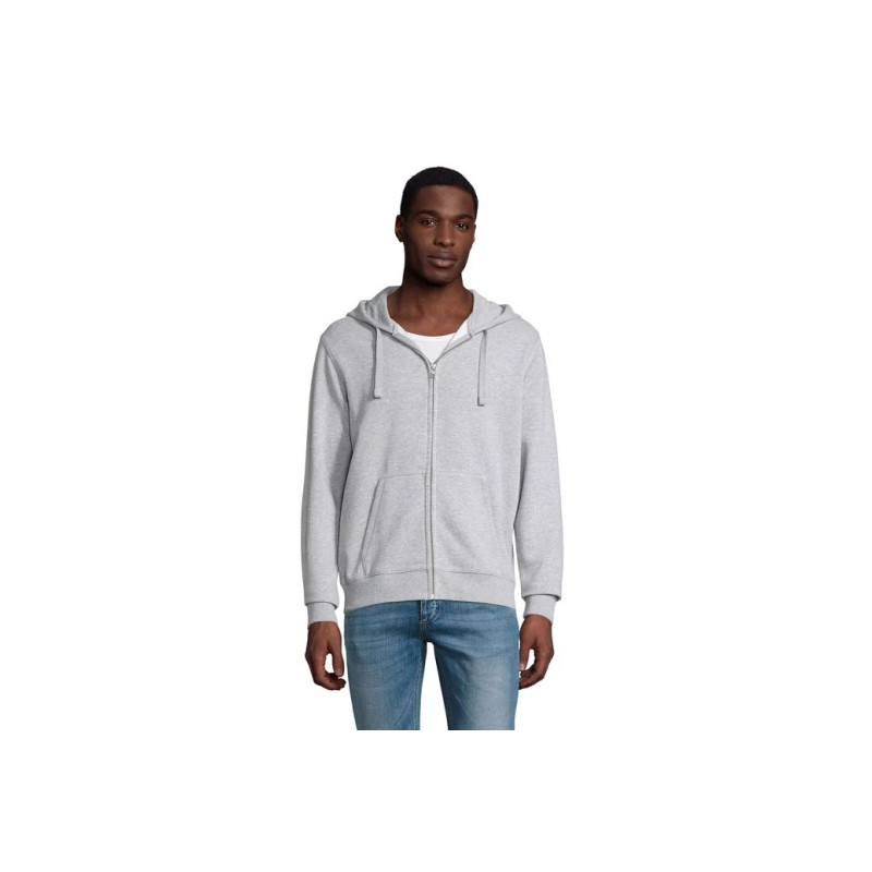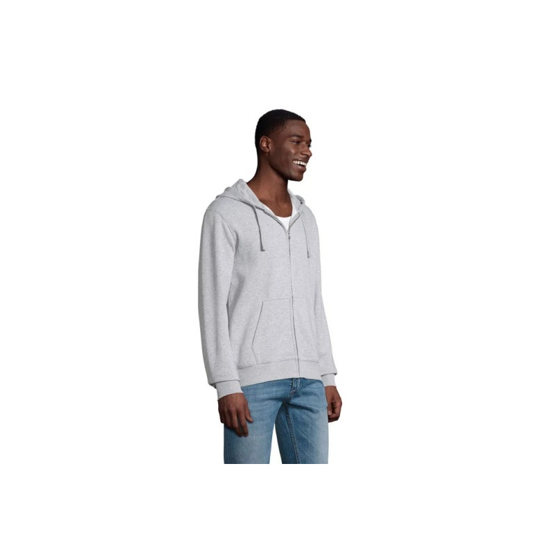 Męska bluza z kapturem na zamek błyskawiczny, 80% bawełna ring spun, szczotkowana bawełna wewnątrz, na zewnątrz: 100% bawełna FLEECE 280 LSF (Low Shrinkage Fabric), dopasowane rękawy, 2 przednie kieszenie, podszyty kaptur ze sznurkiem ściągającym w kolorze, 2x2 prążkowane mankiety i obszycie. Wewnętrzny kołnierz półksiężycowy, zamek błyskawiczny YKK. OEKO-TEX®. Sprzedawana tylko z nadrukiem.