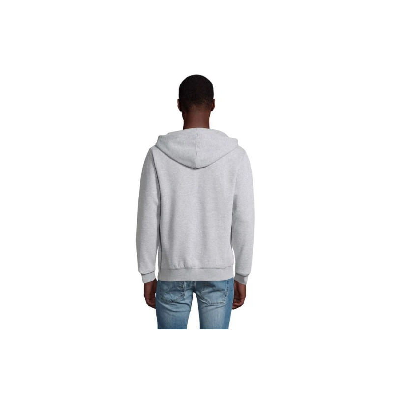 Model został wyposażony w dwie przednie kieszenie, podszyty kaptur ze sznurkiem w kolorze bluzy, a także zamek błyskawiczny YKK, który podkreśla jakość wykonania. Prążkowane mankiety i dół (2x2) oraz półksiężycowy kołnierz wewnętrzny zwiększają wygodę i trwałość produktu.