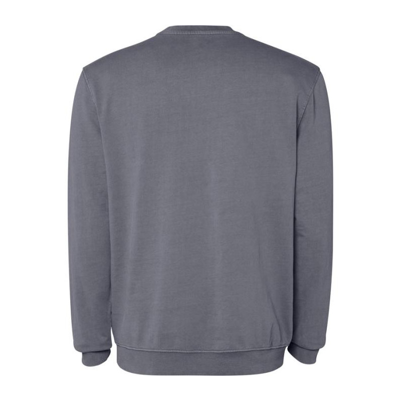 Sweter unisex z wykończeniem uzyskanym dzięki poddaniu działaniu wybielacza w celu uzyskania smug lub odbarwień. Prążkowany ściągacz 2x1 przy dekolcie, mankiety i dół w tym samym kolorze. Wzmocnione szwy przy mankietach, u dołu, w pasie i otworach na ręce. Ścieg kryty ton w ton przy dekolcie.
