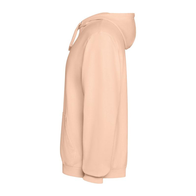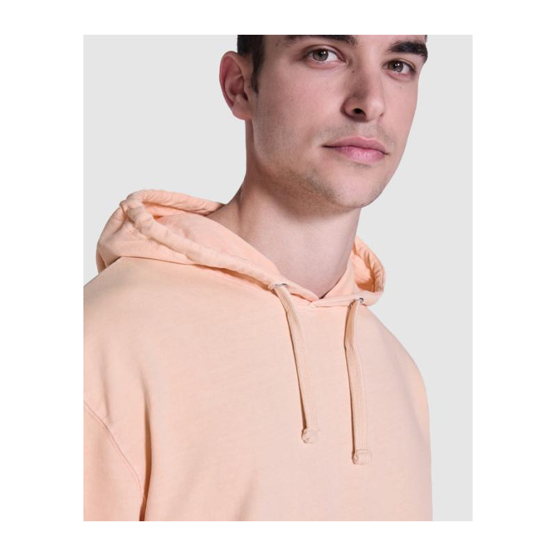 Bluza z kapturem typu unisex z wykończeniem wykończeniem uzyskanym dzięki poddaniu działaniu wybielacza w celu uzyskania smug lub odbarwień. Mankiety i talia wykończone prążkowanym ściągaczem 2x1. Kaptur podszyty dzianiną single dżersej w tym samym kolorze, z dopasowanymi płaskimi sznurkami. Ścieg kryty ton w ton przy dekolcie. Kieszeń kangurka.