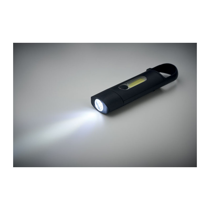 Kieszonkowa latarka akumulatorowa COB z karabińczykiem z tworzywa ABS. Światło awaryjne i 3 tryby oświetlenia. 1 x akumulator litowy 3,7 V, 200 mAh (w zestawie, niewymienialny).