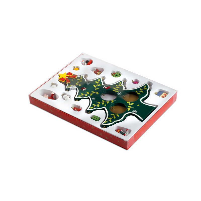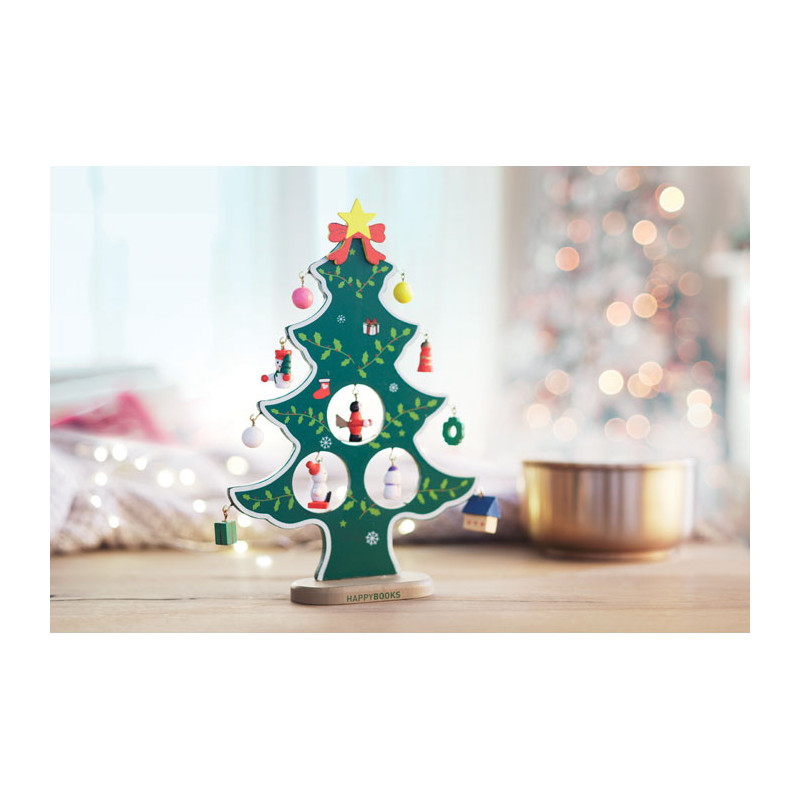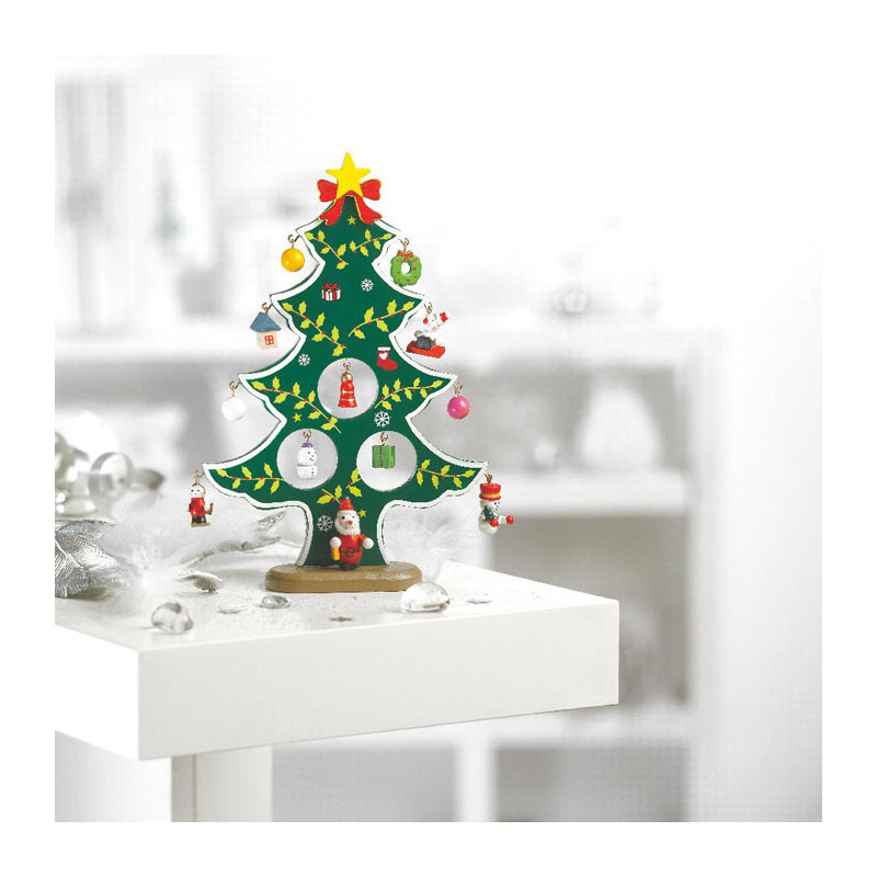 Drewniana choinka z 12 zawieszkami do samodzielnego zmontowania. Zapakowana w ozdobne pudełko z przezroczystą pokrywką.