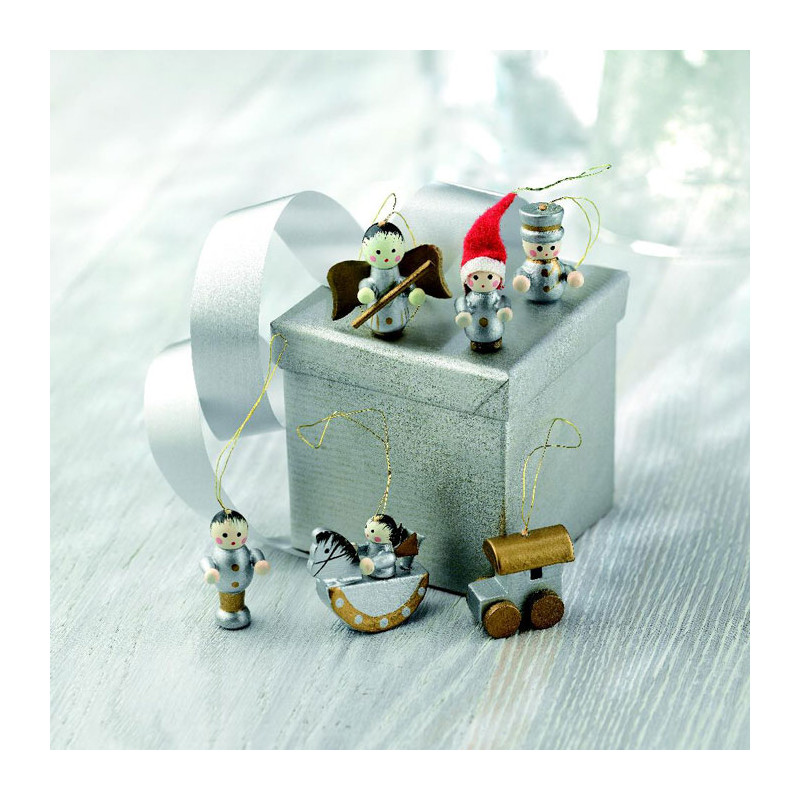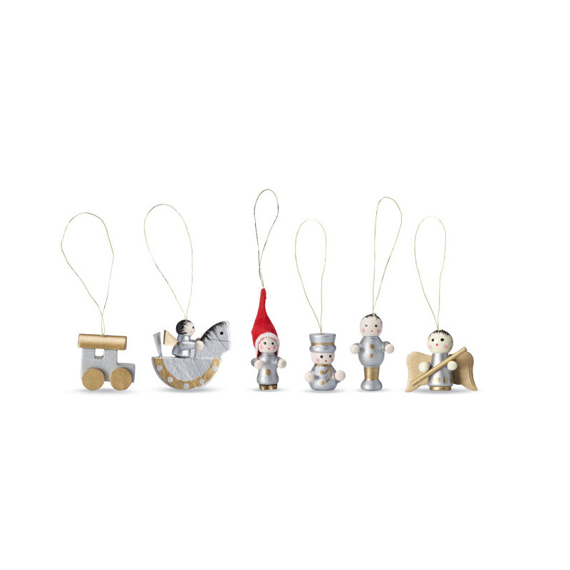 Komplet 6 drewnianych zawieszek na choinkę, zapakowanych w kartonowe pudełko z przezroczystym wieczkiem.