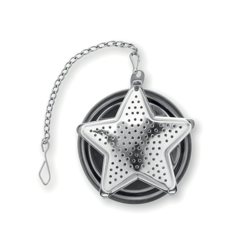 Zaparzacz do herbaty w kształcie gwiazdki, wykonany ze stali nierdzewnej, z przedłużonym łańcuszkiem i mini talerzykiem.
