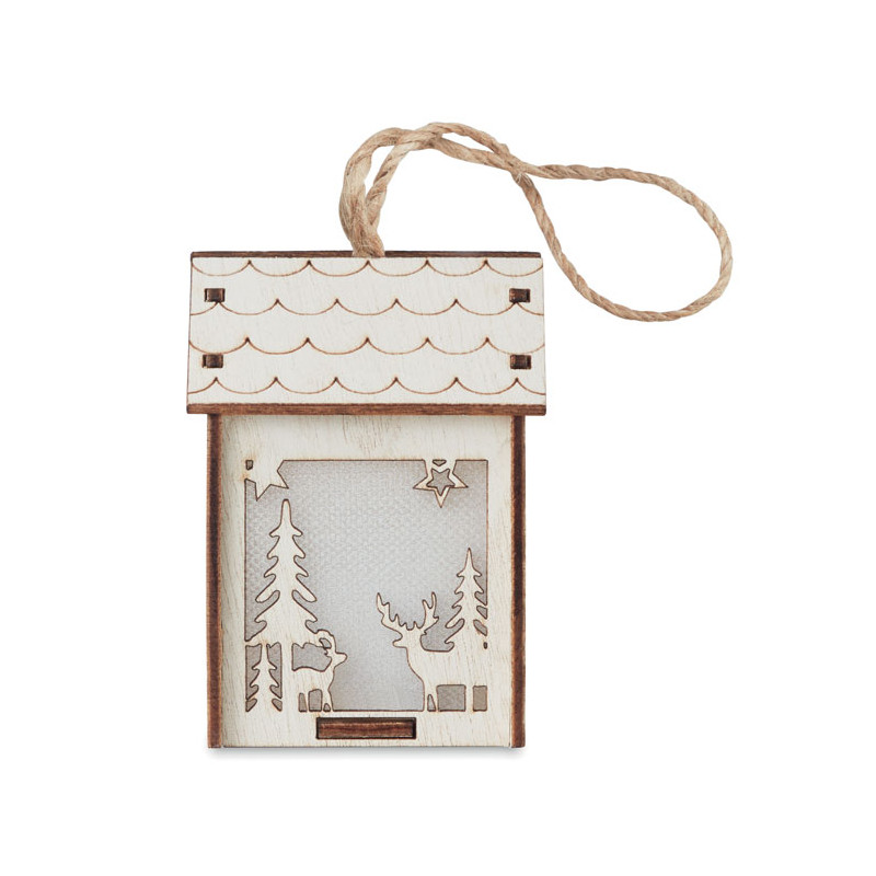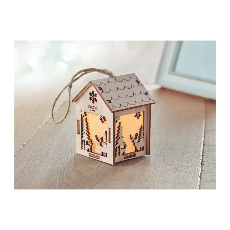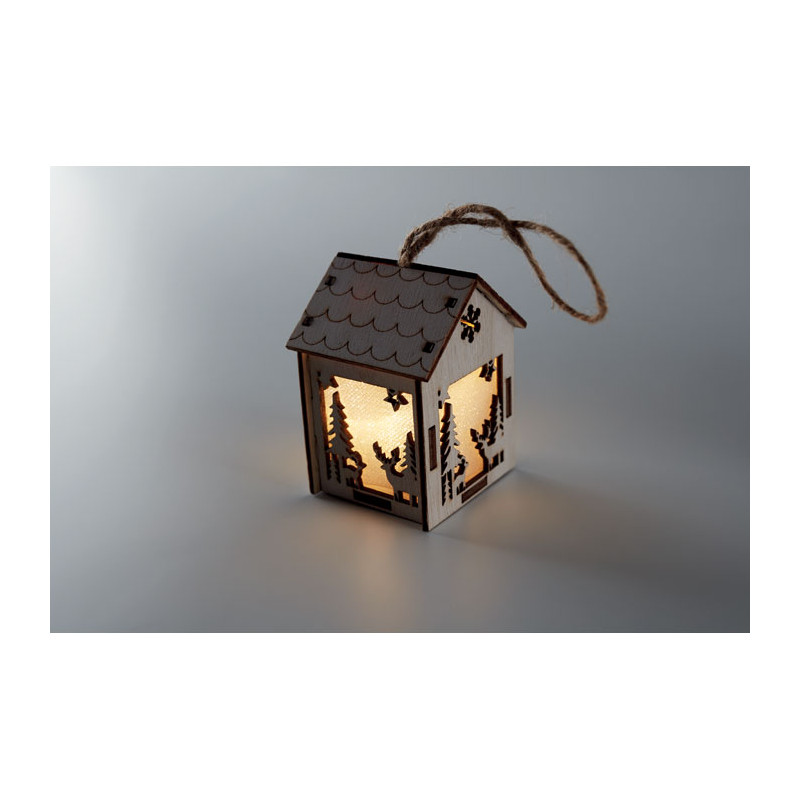 Domek wykonany z MDF z wewnętrzną lampką. Ozdobiony świątecznymi ornamentami, posiada sznurek umożliwiający zawieszenie. Dołączone 3 baterie AG10.