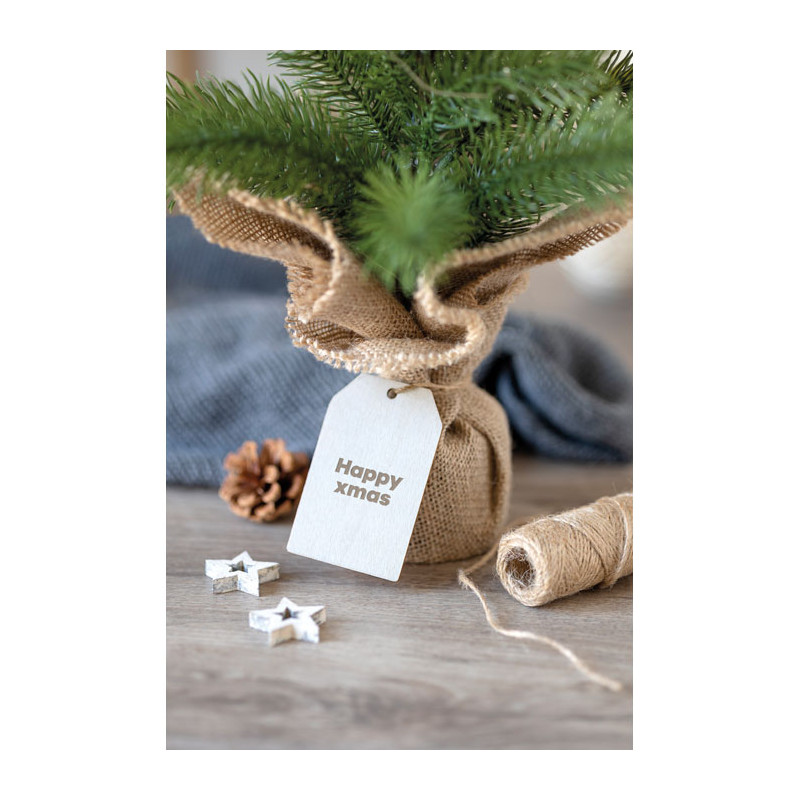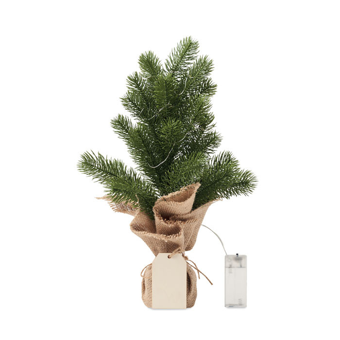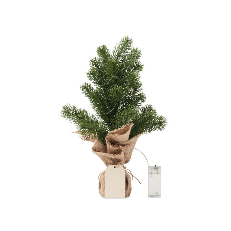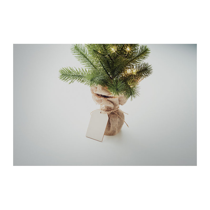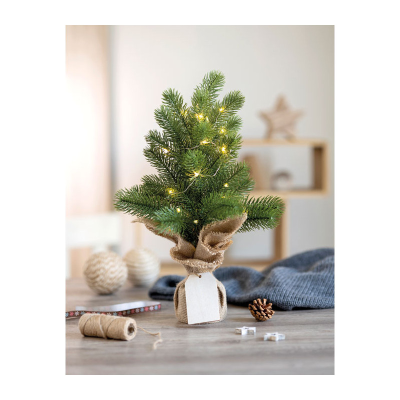 Mała sztuczna choinka z 20 lampkami LED o ciepłej żółtej barwie światła, na jutowym stojaku. Dołączona drewniana zawieszka na prezent. Zestaw nie zawiera 2 baterii AA.