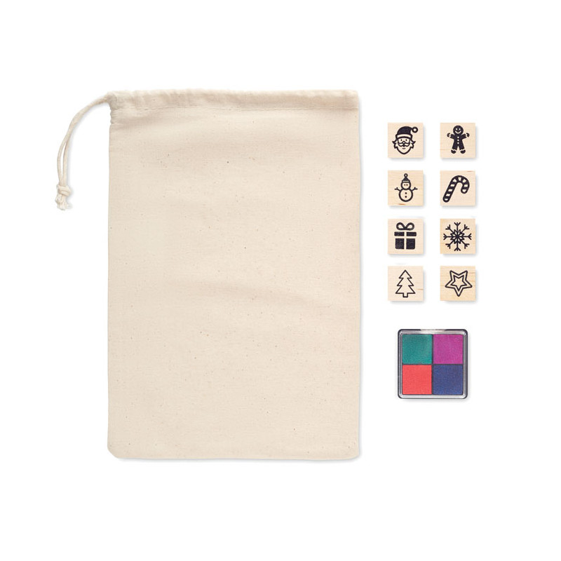 Zestaw 8 drewnianych stempli świątecznych w bawełnianej torbie ze sznurkiem.