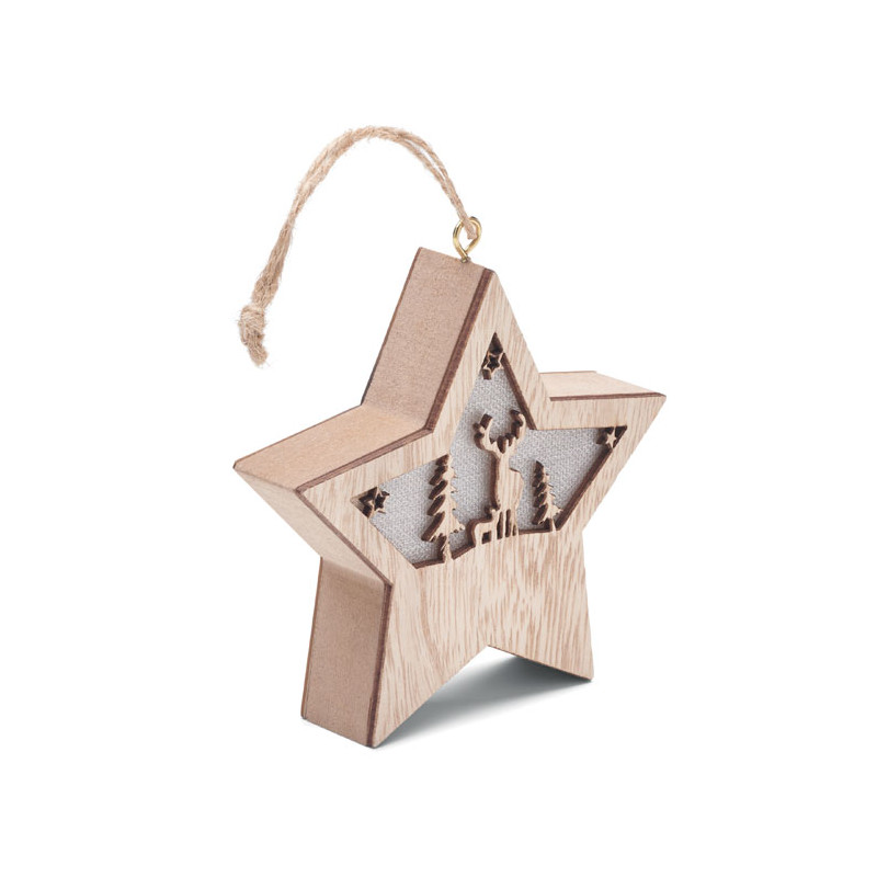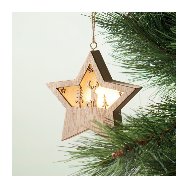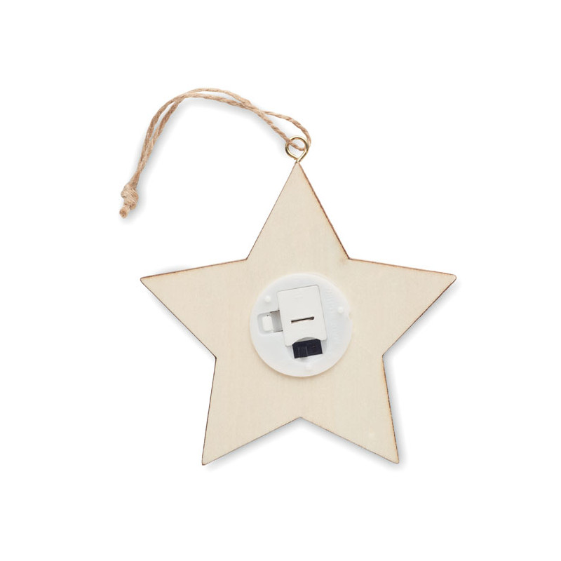 Gwiazda z płyty MDF z lampką w środku, z ozdobami świątecznymi i sznurkiem do zawieszania. Zawiera 3 baterie LR44.