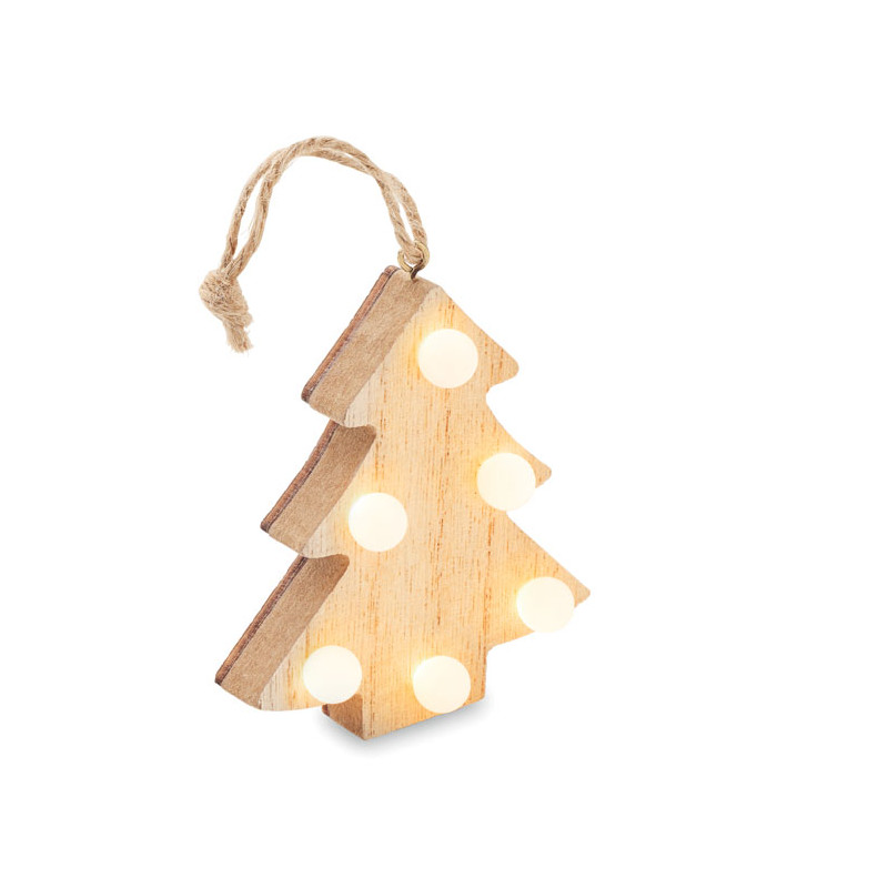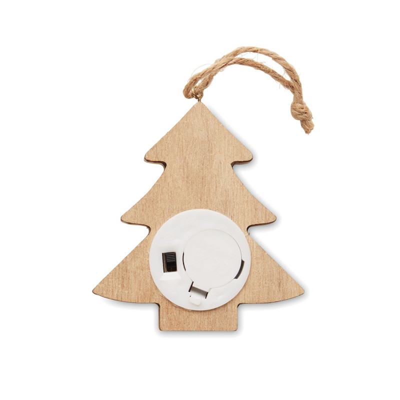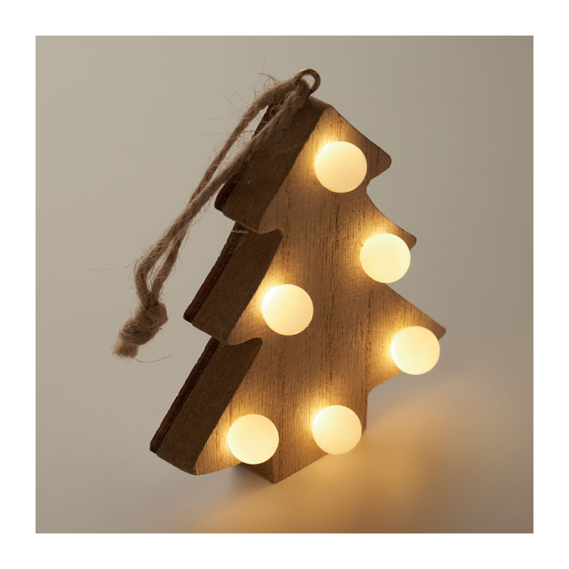Drewniana (80% topoli i 20% weed wood) ozdobna choinka z 6 lampkami LED i sznurkiem do zawieszenia. Zawiera 1 baterię CR2032. Drewno jest produktem naturalnym, dlatego mogą występować niewielkie różnice w kolorze i rozmiarze poszczególnych elementów, co może mieć wpływ na ostateczny efekt zdobienia.