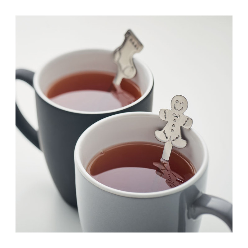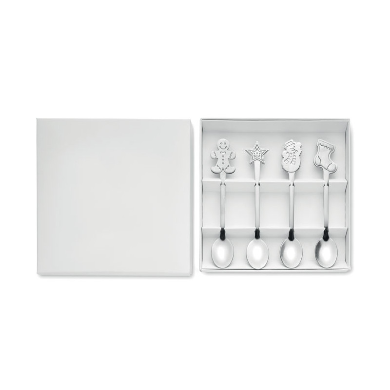 Zestaw 4 różnych łyżeczek do herbaty z motywem świątecznym ze stali nierdzewnej. Prezentowane w pudełku upominkowym.