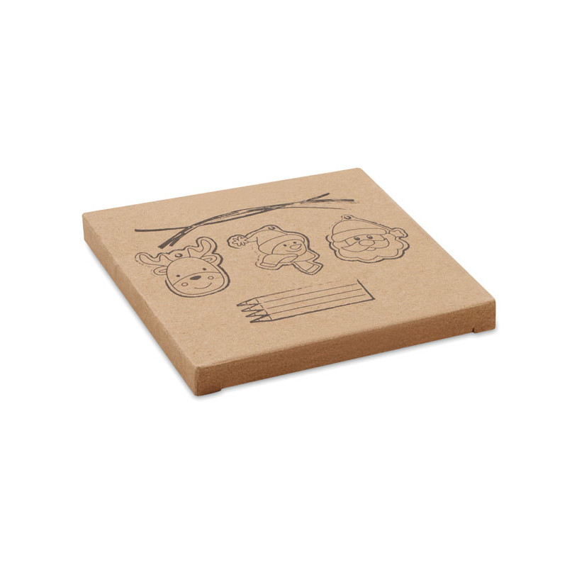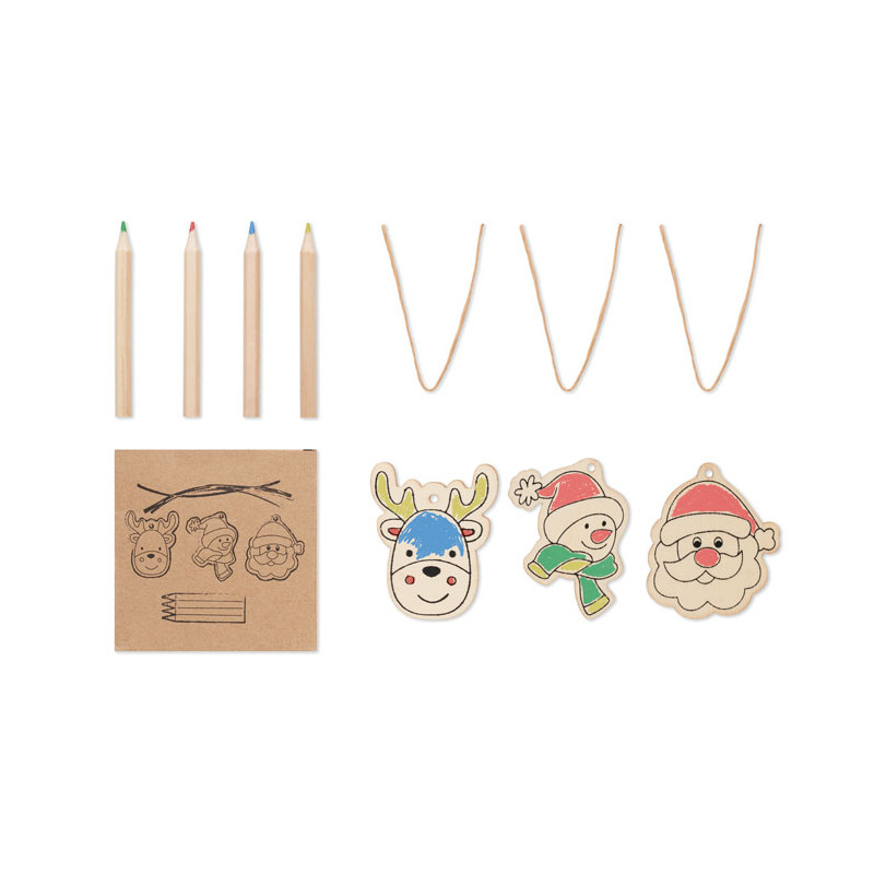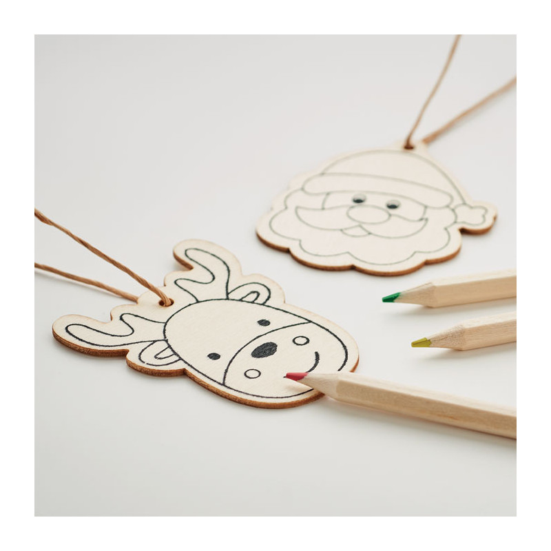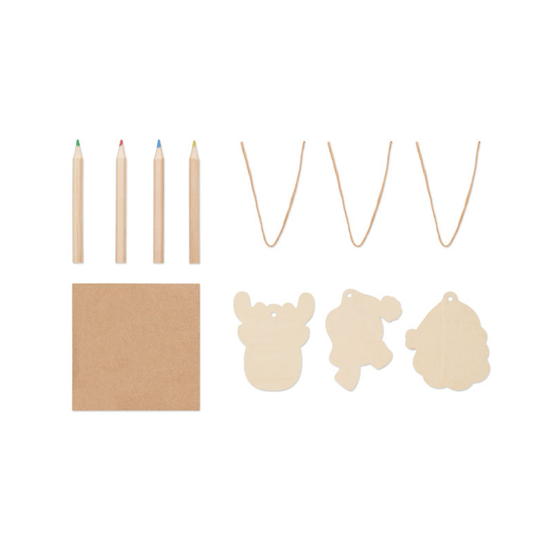 Zestaw 3 drewnianych ozdób świątecznych z 4 kredkami do kolorowania. Całość w pudełku tupy kraft. Drewno jest produktem naturalnym, dlatego mogą występować niewielkie różnice w kolorze i rozmiarze poszczególnych elementów, co może mieć wpływ na ostateczny efekt zdobienia.