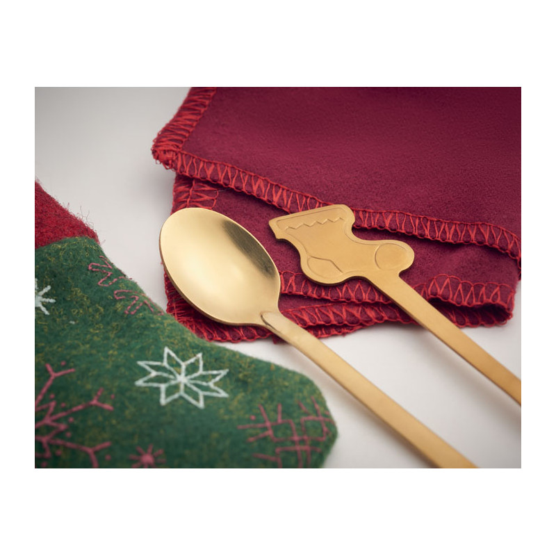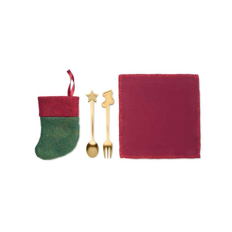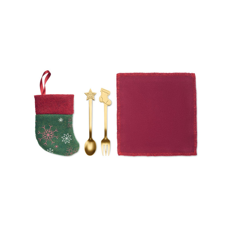 Świąteczny zestaw sztućców deserowych zawierający łyżkę i widelec ze stali nierdzewnej oraz bawełnianą serwetkę 150 gr/m2. Zapakowane w świąteczne etui w kształcie skarpety.