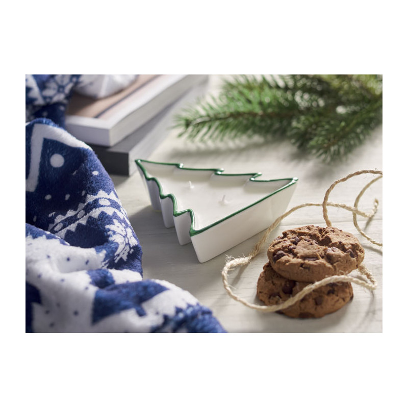 Świeca na bazie wosku roślinnego w porcelanowym pojemniku w kształcie choinki z 2 knotami. Waga: 60 g. Czas palenia: 4 godziny.