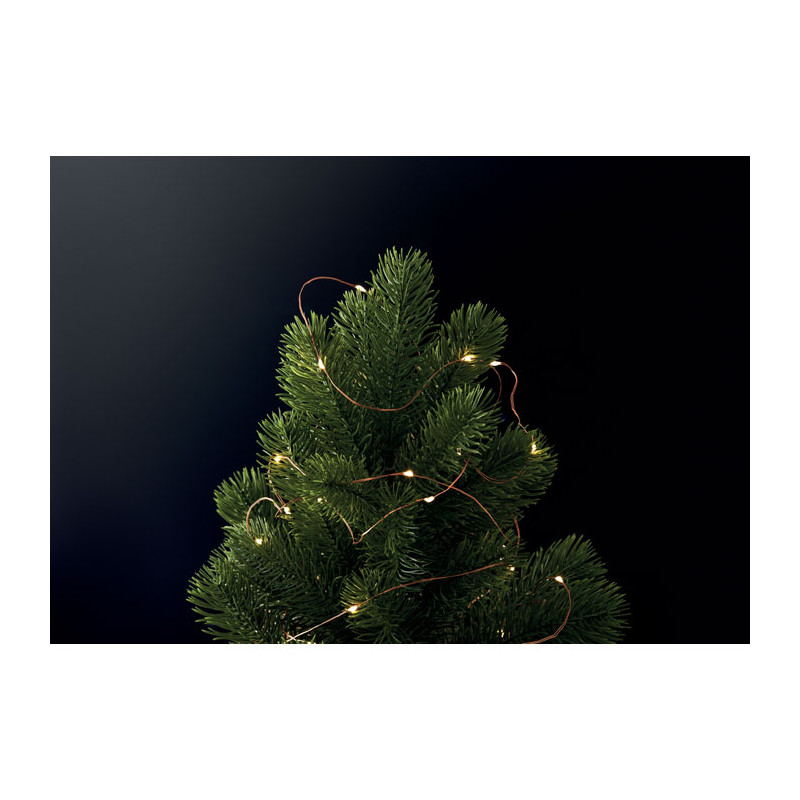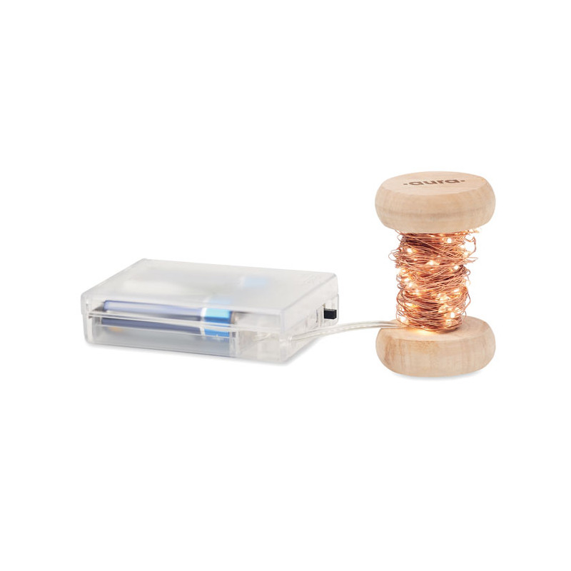 Sznur 50 lampek LED o ciepłej żółtej barwie światła na drewnianej szpuli. Długość: 5 m. Baterie (3 szt. AA) nie są dołączone.