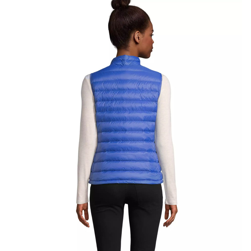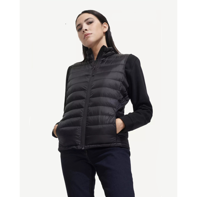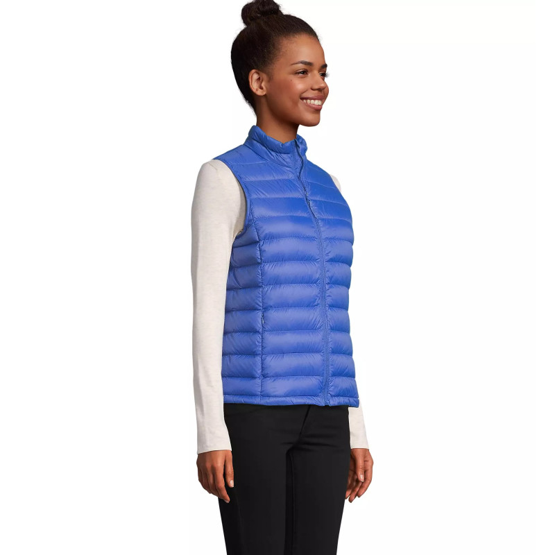 Damska lekka puchowa kamizelka zapinana zamkiem błyskawicznym, 2 przednie kieszenie na zamek błyskawiczny, 2 kieszenie wewnętrzne. Mały wysoki, kołnierz, dopasowany krój, system składania ''In bag'' ze stoperami. OEKO-TEX®. Sprzedawana tylko z nadrukiem.