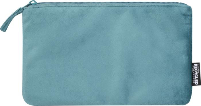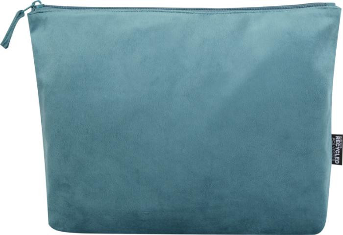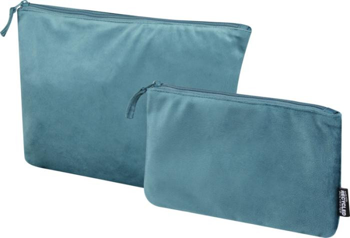 Zestaw 2 kosmetyczek wykonanych z certyfikowanego przez GRS aksamitnego poliestru pochodzącego z recyklingu. Zestaw zawiera jedną dużą i jedną małą saszetkę umożliwiającą uporządkowane przechowywanie. Lekkie, trwałe i łatwe do spakowania. Duża torba ma wymiary 32 x 21 cm, mała torba ma wymiary 23 x 13 cm.