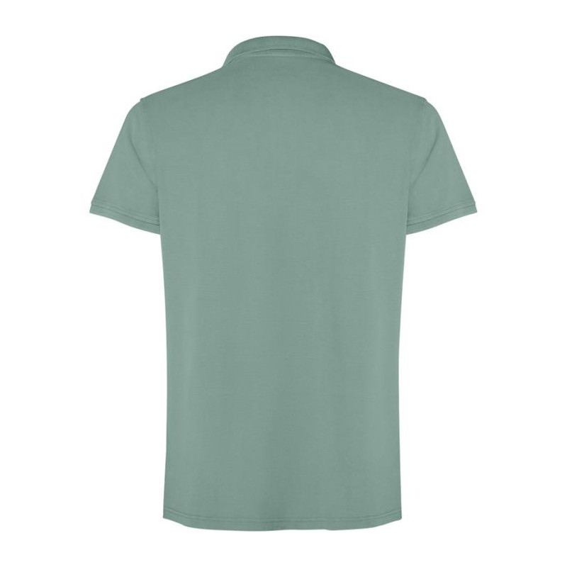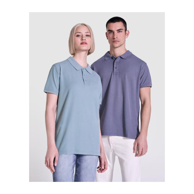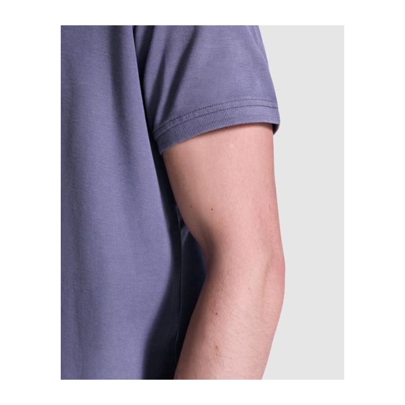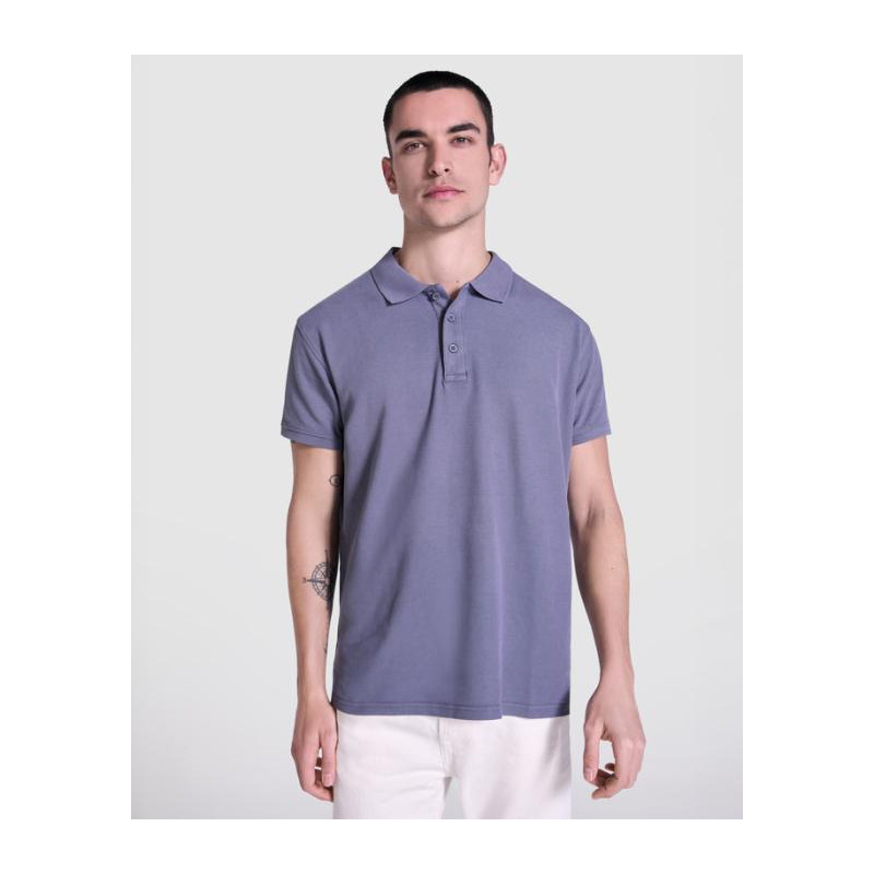 Koszulka polo unisex z krótkim rękawem Wykończenie uzyskane dzięki poddaniu działaniu wybielacza w celu uzyskania smug lub odbarwień. Dekolt i mankiety wykończone prążkowanym ściągaczem 1x1, z otworami po bokach. Ścieg kryty ton w ton. Zapięcie na trzy guziki.