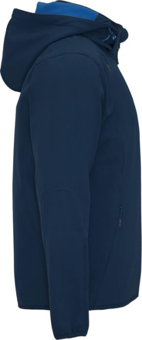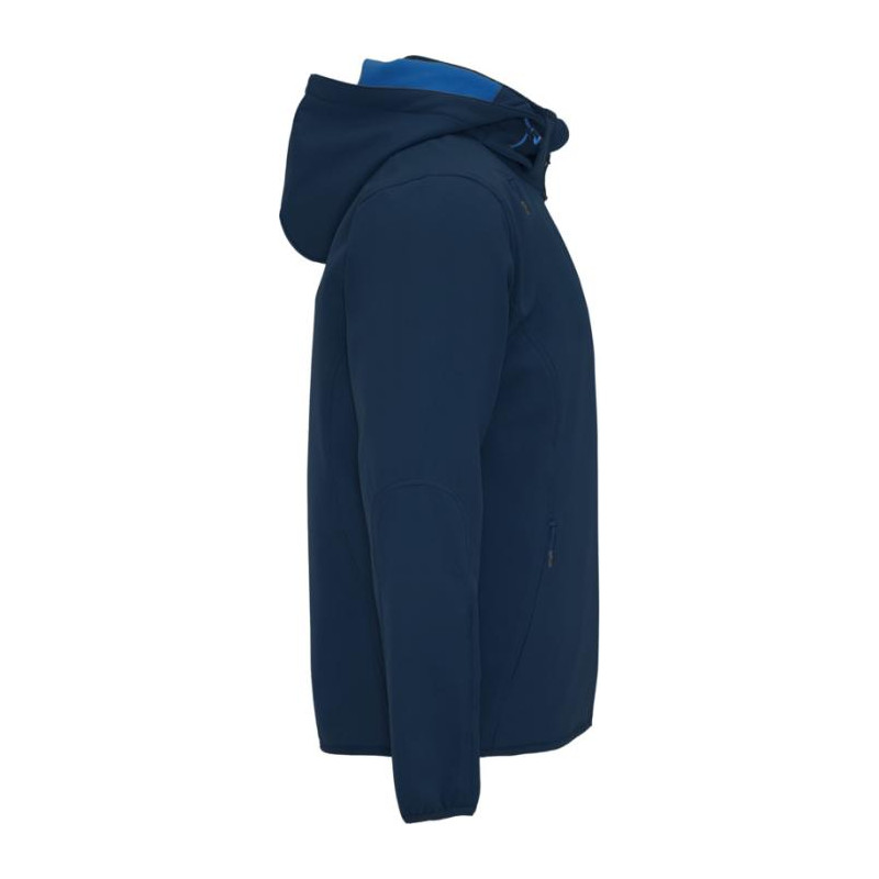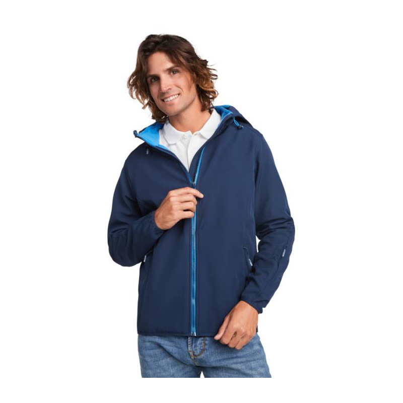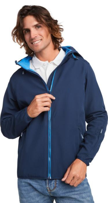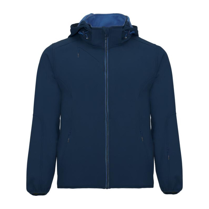 2-warstwowy softshell o sportowym kroju: Kontrastowy centralny zamek błyskawiczny z ochraniaczem podbródka i ściągaczem. Wewnętrzna podszewka z kontrastowego mikropolaru. Zewnętrzna kieszeń na prawej piersi z niewidocznym zamkiem błyskawicznym po przekątnej. Dwie kieszenie boczne z niewidocznym zamkiem błyskawicznym. Kieszeń na lewym rękawie. Dopasowane elastyczne wykończenie mankietów i dołu. Składany kaptur z kontrastową mikropolarową podszewką. Usuwalna metka. Wodoodporna. Wiatroszczelna.