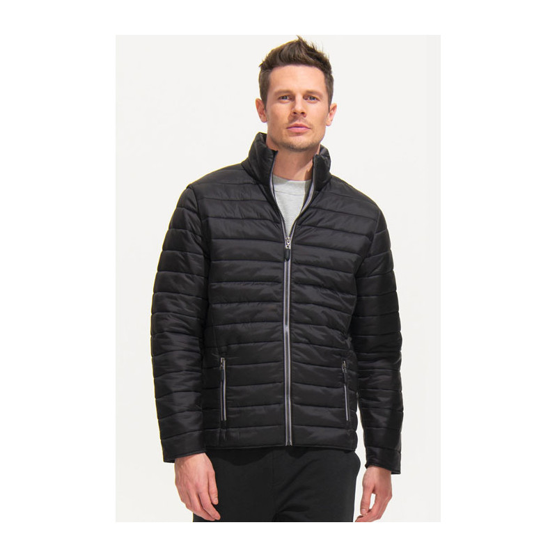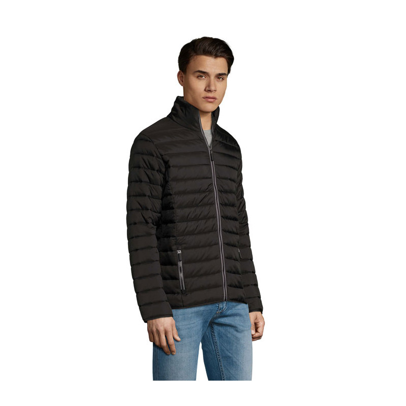 Lekka męska kurtka ze ściągaczem. Delikatnie wyściełana z kontrastową podszewką. Materiały odporne na wiatr i wodę. 2 zapinane na zamek kieszenie, które pasują do podszewki, wysoki kołnierz, tasiemka u dołu i na rękawach.