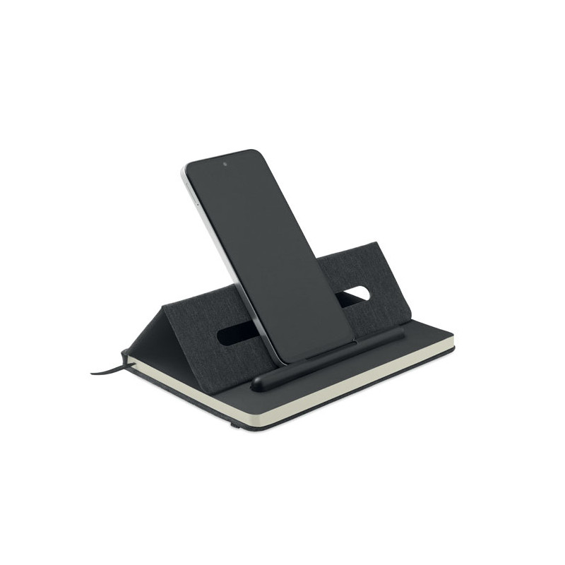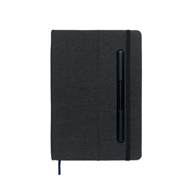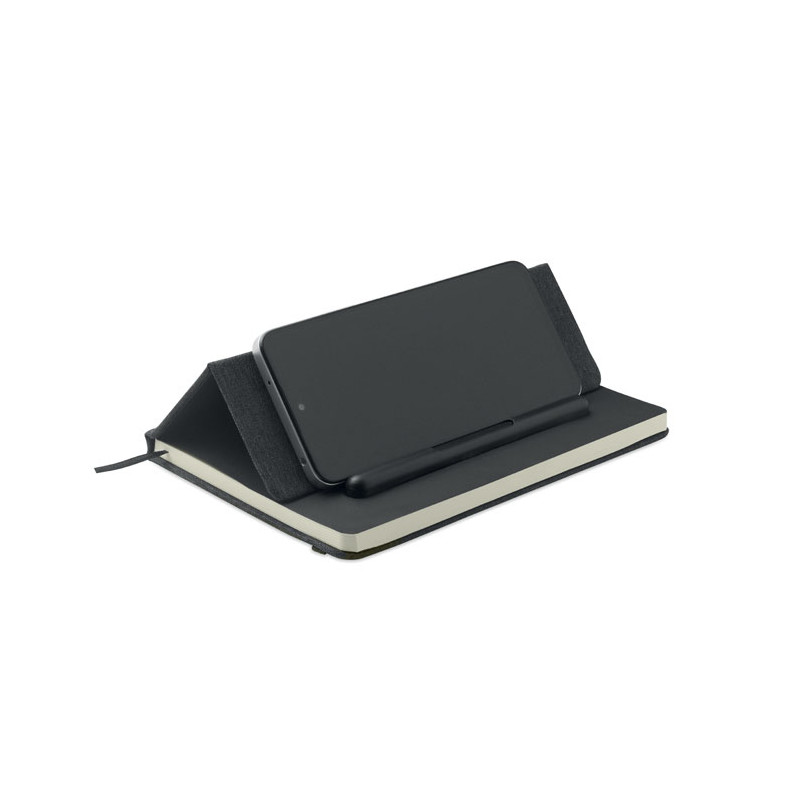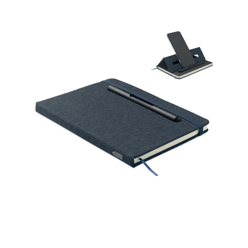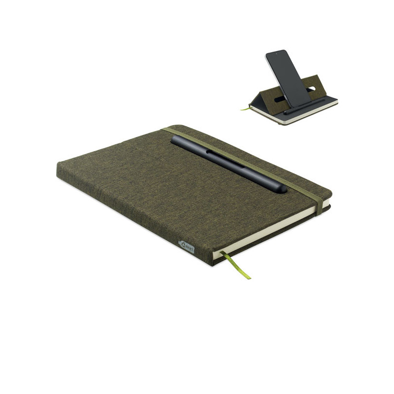 Notatnik A5 z twardą okładką z RPET z funkcją uchwytu na telefon. Zintegrowany długopis 2 w 1 z ABS. 192 strony w linie z papieru z recyklingu (96 arkuszy). Dopasowana gumka zamykająca i zakładka z tasiemki.