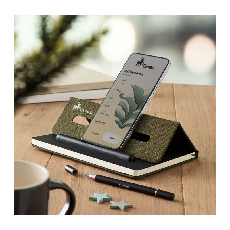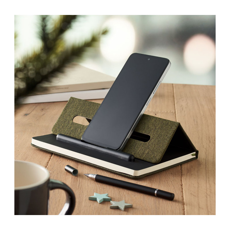 Nowoczesny notatnik A5 z logo wykonany z materiału RPET to praktyczny gadżet firmowy, który łączy elegancję, ekologię i wygodę użytkowania. Twarda okładka z recyklingu zapewnia trwałość, a innowacyjna funkcja uchwytu na telefon sprawia, że notatnik świetnie sprawdza się w biurze, podczas spotkań i w podróży. W zestawie znajduje się zintegrowany długopis 2 w 1, dzięki czemu masz wszystko pod ręką.