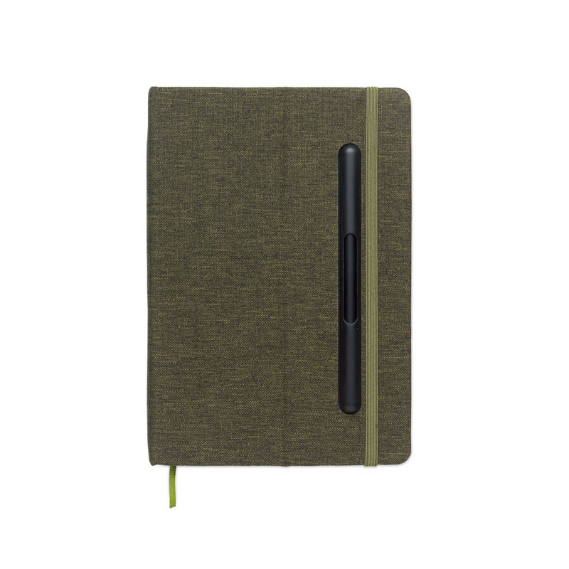 - Materiały: RPET (okładka), papier z recyklingu, ABS (długopis)