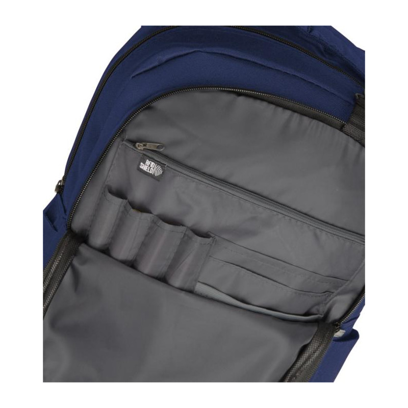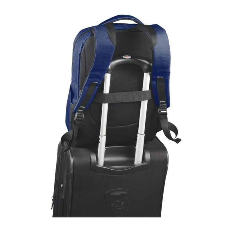 Plecak na laptop 15" z kieszenią na przodzie zawierającą miejsce na klucze, oraz kieszonką z ochroną RFID na karty kredytowe. Główny przedział zapinany na zamek pomieści laptop 15" i dodatkowo tablet w oddzielnej wyściełanej kieszeni. Zamek na froncie umożliwia szybki dostęp do przedniej kieszeni. Dwie dodatkowe kieszenie boczne. Wyściełane, regulowane szelki dają komfort użytkowania i możliwość zamocowania na nich innych przedmiotów. Posiada rączkę do przenoszenia oraz uchwyt umożliwiający założenie plecaka na walizkę.