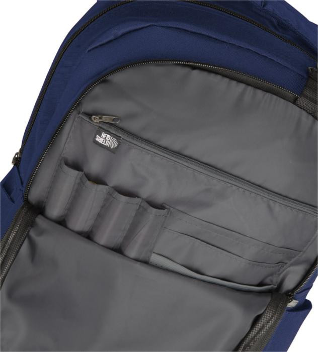 Plecak na laptop 15" z kieszenią na przodzie zawierającą miejsce na klucze, oraz kieszonką z ochroną RFID na karty kredytowe. Główny przedział zapinany na zamek pomieści laptop 15" i dodatkowo tablet w oddzielnej wyściełanej kieszeni. Zamek na froncie umożliwia szybki dostęp do przedniej kieszeni. Dwie dodatkowe kieszenie boczne. Wyściełane, regulowane szelki dają komfort użytkowania i możliwość zamocowania na nich innych przedmiotów. Posiada rączkę do przenoszenia oraz uchwyt umożliwiający założenie plecaka na walizkę. Ze względu na rodzaj barwników tkanin, splotów i nadruków mogą występować niewielkie różnice w kolorze rzeczywistego produktu.