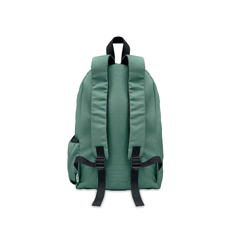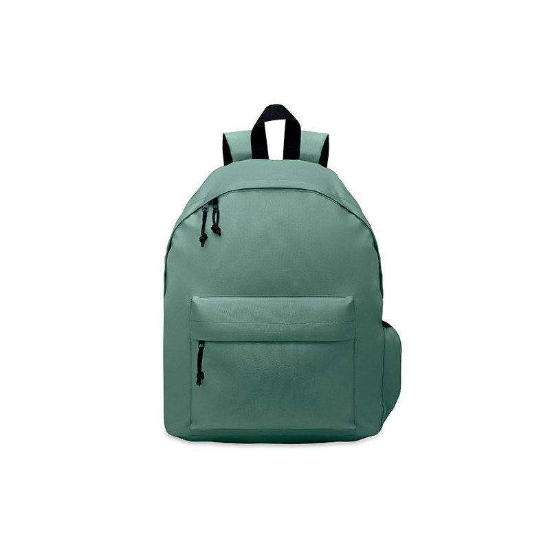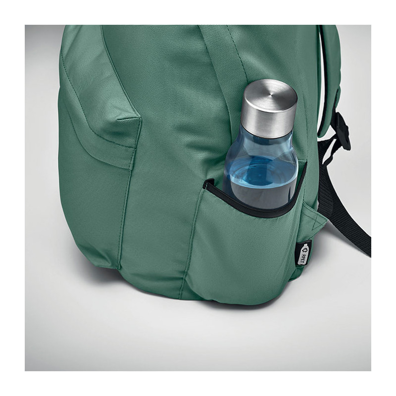 Plecak z poliestru 600D RPET z zewnętrzną kieszenią na zamek. Wyściełany tył i boczna przegródka na butelkę.