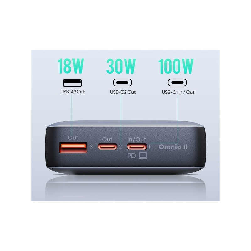 Urządzenie umożliwia ładowanie trzech sprzętów jednocześnie — posiada dwa porty USB-C oraz jeden USB-A. Wyposażone jest w czytelny wyświetlacz LCD, który pokazuje poziom naładowania i moc ładowania. Dzięki kompaktowym rozmiarom i niskiej wadze można je wygodnie przenosić, a zaawansowane zabezpieczenia gwarantują pełne bezpieczeństwo dla wszystkich podłączonych urządzeń.