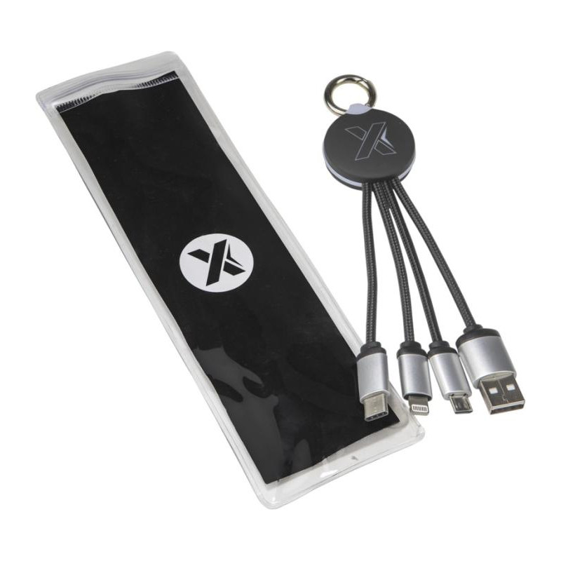 Kabel do ładowania z podświetlanym logo z gumowanym i metalowym wykończeniem wyposażony w trzy złącza (USB typu C, Android, iPhone). Umożliwia jednoczesne ładowanie do trzech urządzeń. Długość kabli (łącznie z wtyczkami): 10 cm. Opakowanie wykonane jest z papieru i tworzywa sztucznego z recyklingu.