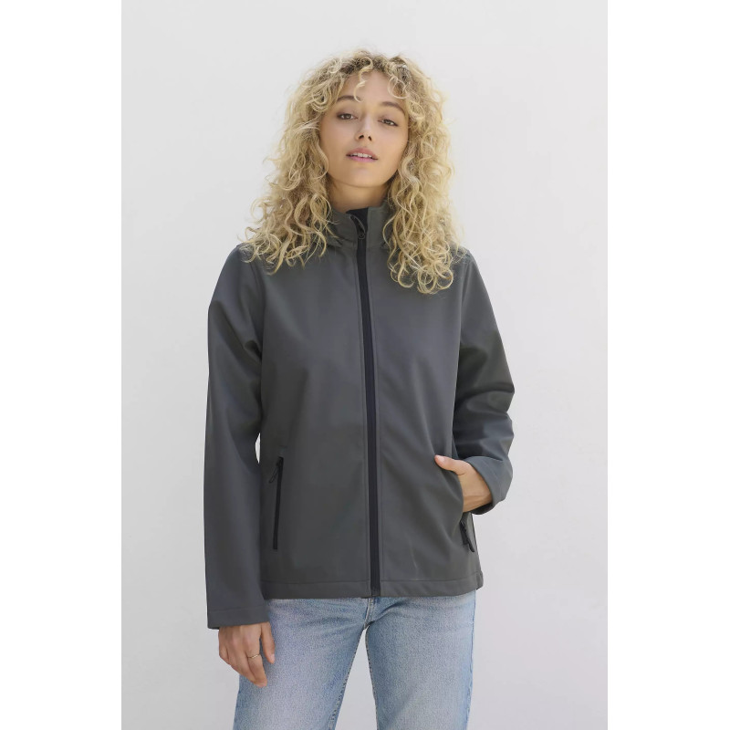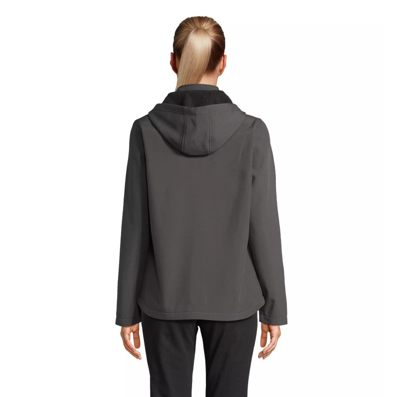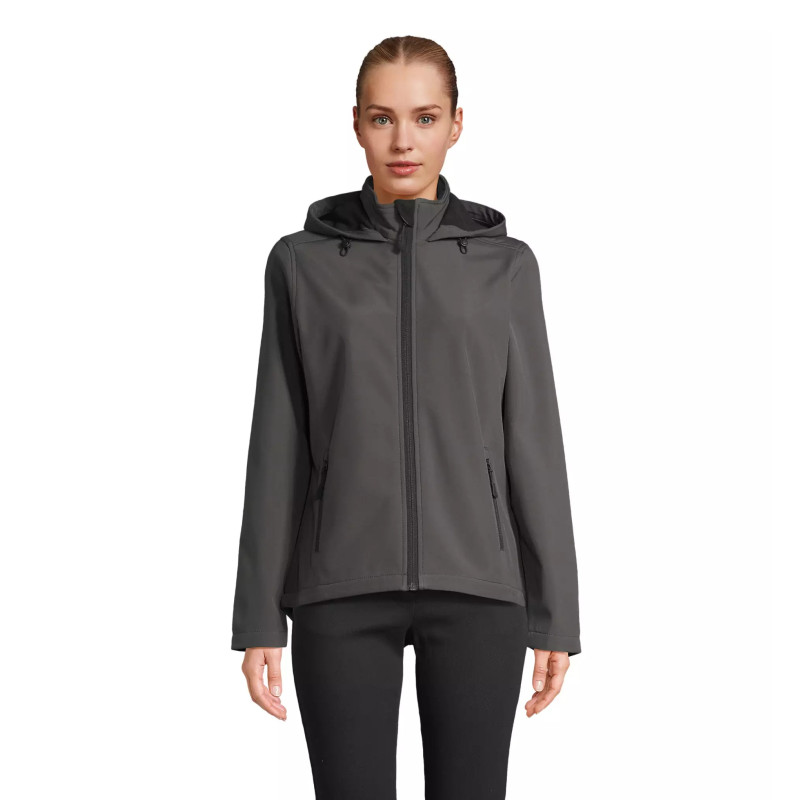 Damski softshell z kapturem wykonany w 100% z poliestru pochodzącego z recyklingu, zapewnia trwałość i komfort noszenia. Dwuwarstwowa konstrukcja z podszewką z mikropolaru gwarantuje ciepło i skuteczną ochronę przed wiatrem.