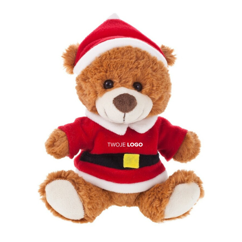Personalizowany pluszowy miś świąteczny w stroju Mikołaja z logo. Doskonały jako upominek świąteczny z nadrukiem dla klientów, pracowników i partnerów biznesowych.