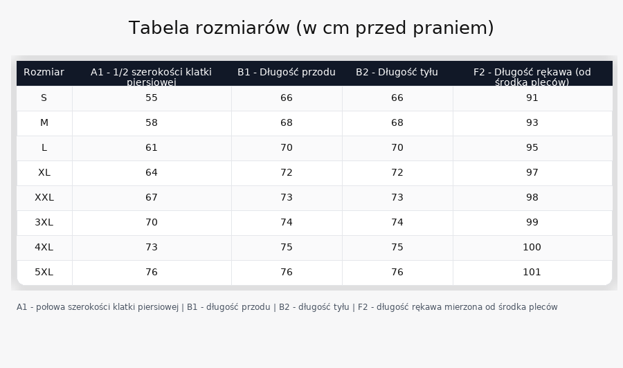 - Rozmiary (sizes): S, M, L, XL, XXL, 3XL, 4XL, 5XL