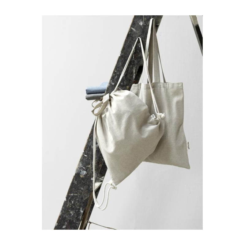 Ekologiczny, lekki i wytrzymały plecak ściągany sznurkiem z logo firmy wykonany z mieszanki bawełny i poliestru pochodzących z recyklingu (150 g/m²) to praktyczny i stylowy produkt idealny do codziennego użytku, eventów i kampanii promocyjnych. Duża komora główna zamykana naturalnym bawełnianym sznurkiem zapewnia wygodę, a lekka konstrukcja ułatwia przenoszenie materiałów, zakupów czy gadżetów.