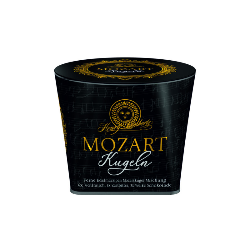 Wyjątkowe praliny Mozart od Henry Lambertz w eleganckiej puszce. Certyfikat Fairtrade i luksusowe opakowanie czynią je doskonałym prezentem świątecznym i biznesowym z logo.