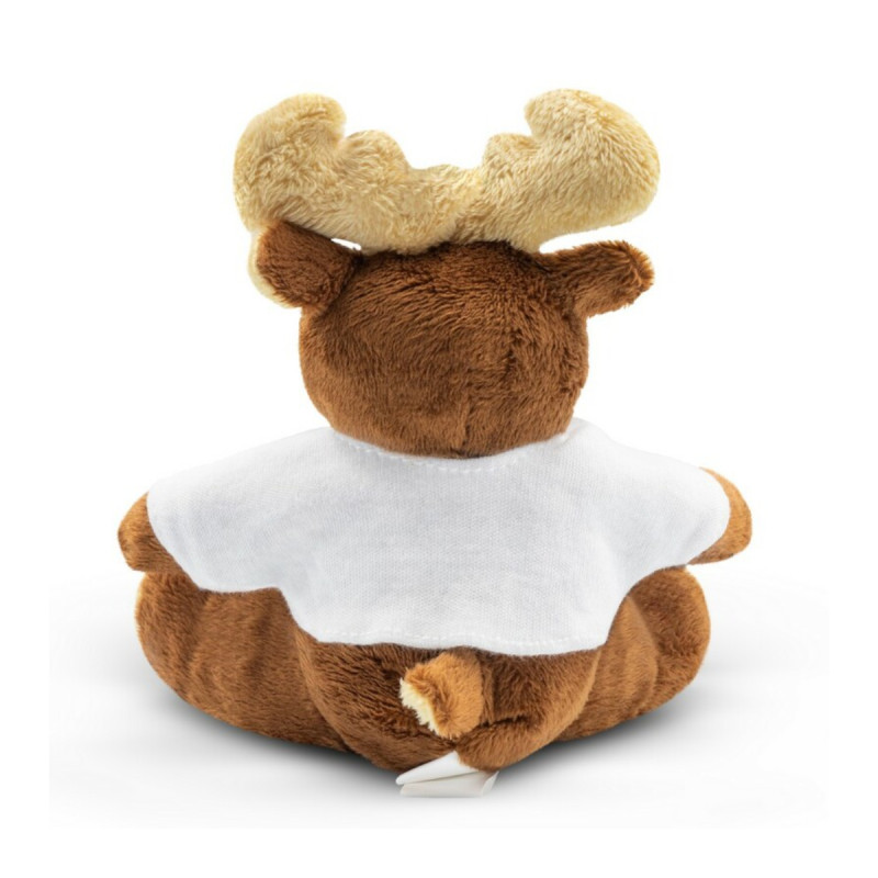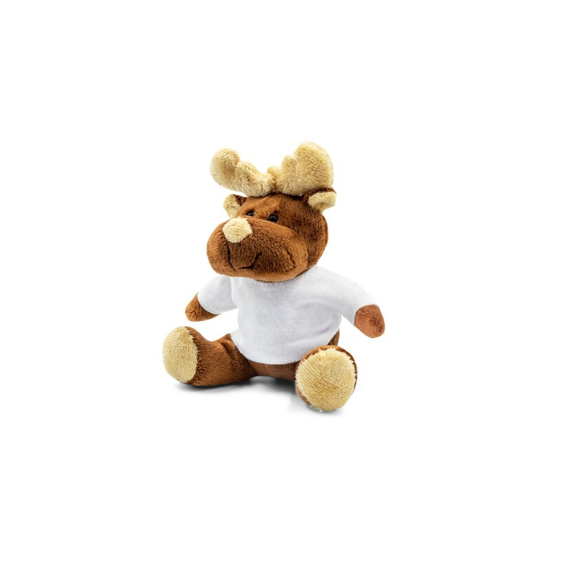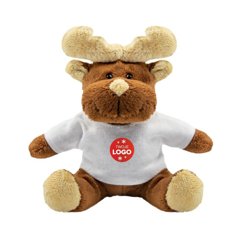 Personalizowany pluszowy renifer z logo w białej koszulce – idealny gadżet do paczek świątecznych i prezentów firmowych.